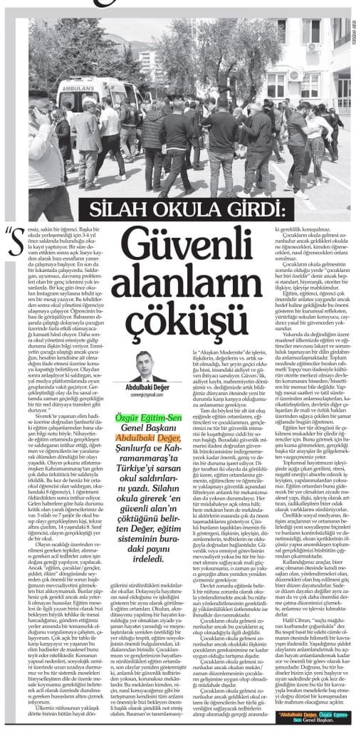 Özgür Eğitim-Sen Genel Başkanı Abdulbaki Değer, Şanlıurfa ve Kahramanmaraş’ta Türkiye’yi sarsan okul saldırılarını yazdı. Silahın okula girerek ‘en güvenli alan’ın çöktüğünü belirten Değer, eğitim sisteminin buradaki payını irdeledi.